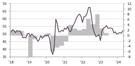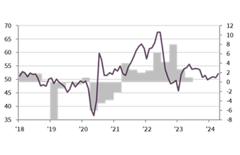 الناتج المحلي الإجمالي، سنة%/سنة PMI معدل موسميًا، >50.0 = تحسن منذ الشهر السابق