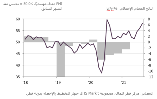 "يشير الارتفاع المتواصل والقراءات الايجابية لمؤشر مديري المشتريات إلى التعافي القوي للناتج المحلي الإجمالي الرسمي في الربعيْن الثاني والثالث من العام الحالي، مما يؤكد على المتانة والمرونة التي أظهرها الاقتصاد القطري في الآونة الأخيرة. فقد ارتفعت قراءة مؤشر مديري المشتريات للشهر الثالث على التوالي في أغسطس 2021 إلى ثاني أعلى مستوى مُسجَّل منذ تاريخ بدء الدراسة عام 2017، مشيرةً إلى تحسُّن عام سريع في النشاط التجاري. وسَجَّلَ مؤشر مديري المشتريات أعلى قراءة شهرية بعد تخفيف إجراءات الإغلاق في يوليو 2020. وكان معدل نمو مؤشرات الإنتاج والطلبات الجديدة هو ثالث أعلى المعدلات المُسجَّلة في تاريخ الدراسة، حيث تحسنت توقعات النشاط للعام المُقبل بدرجة ملحوظة".![]()