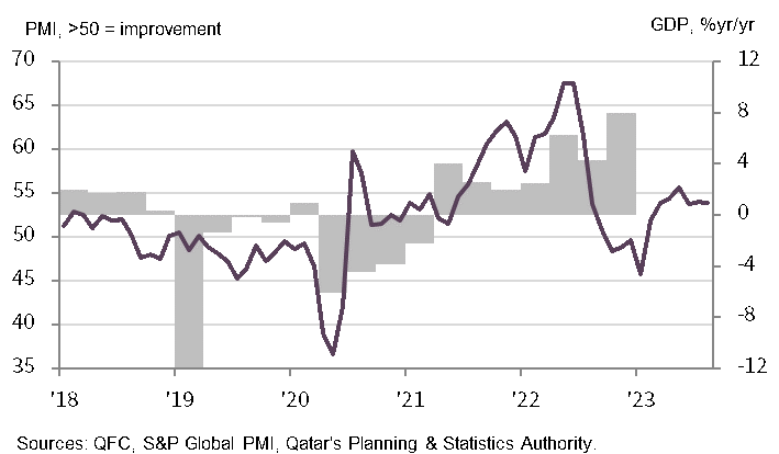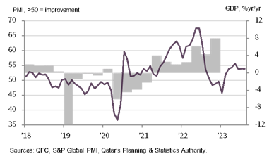 حافظ مؤشر مديري المشتريات لدولة قطر على مستويات ثابتة خلال الأشهر الستة الأخيرة بفضل النمو الاقتصادي القوي. ومنذ مارس ۲۰۲۳، شَهِدَت القراءة الرئيسية للمؤشر تغيرات طفيفة تراوحت من ٥۳.۸ نقطة إلى ٥٥.٦ نقطة وهي أعلى بكثير من متوسط الدراسة على المدى الطويل البالغ ٥۲.۳ نقطة.