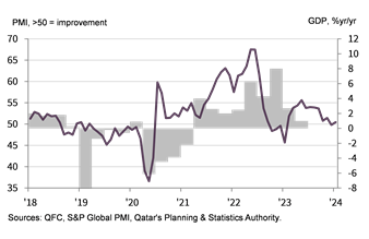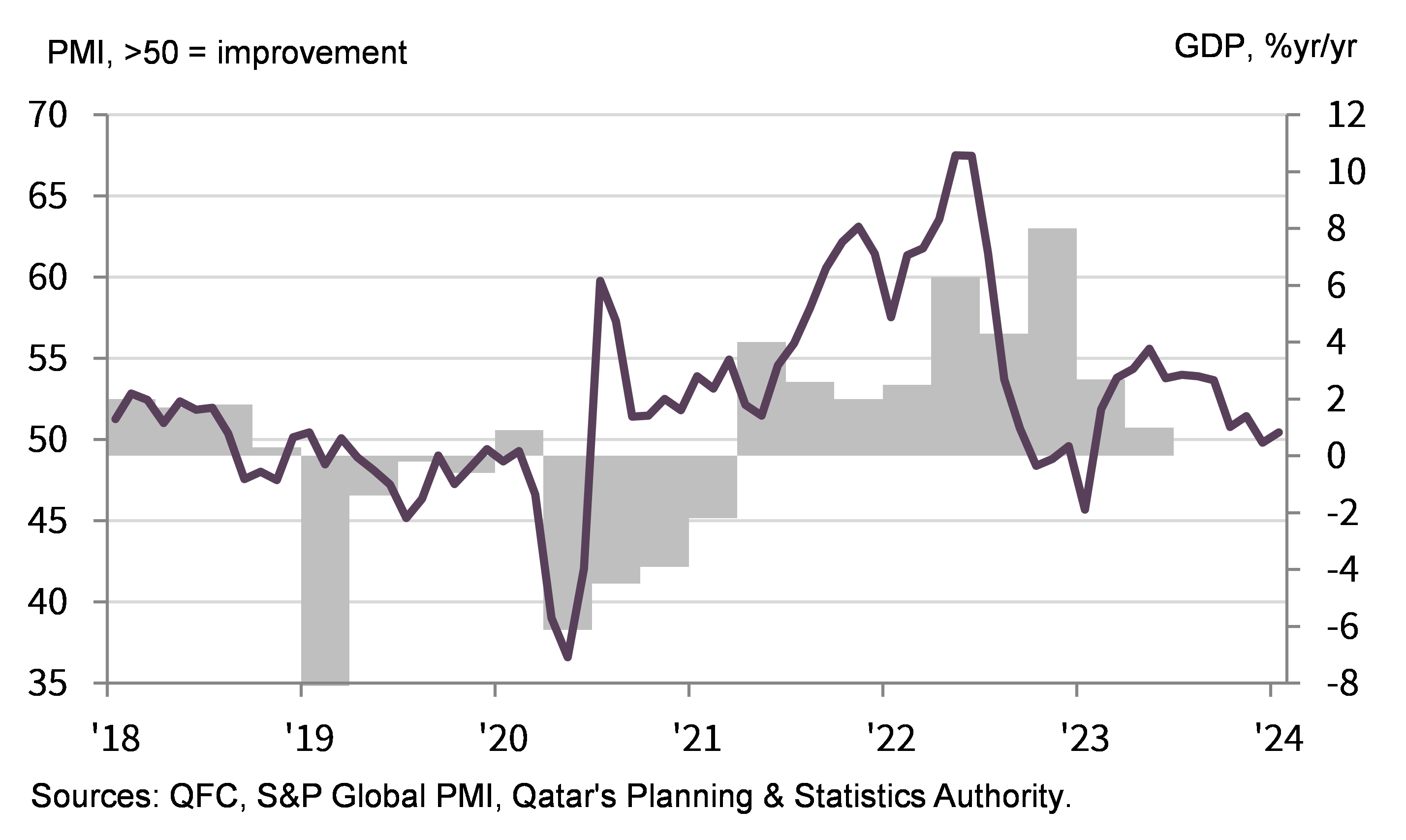 أشارت بيانات مؤشر مديري المشتريات للشهر الأول من عام ۲۰۲٤ إلى تحسُّن النشاط التجاري لشركات القطاع الخاص غير المرتبط بالطاقة في قطر بعد النمو الاقتصادي القوي في عام ۲۰۲۳.