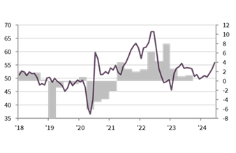وارتفع مؤشر مديري المشتريات من ٥٣.٦ نقطة في مايو إلى ٥٥.٩ نقطة في يونيو، مشيراً إلى أقوى تحسُّن في النشاط التجاري لشركات القطاع الخاص غير النفطي منذ يوليو ٢٠٢٢. وكانت قراءة المؤشر أعلى من مستوى الاتجاه على المدى الطويل البالغ ٥٢.٣ نقطة (منذ أبريل ٢٠١٧). وارتفعت القراءة الرئيسية للمؤشر للمرة الخامسة في ٢٠٢٤ حتى الآن وكان ارتفاع مؤشر مديري المشتريات بواقع ٢.٣ نقطة من أعلى الارتفاعات المسجلة في السنوات الثلاث الماضية.