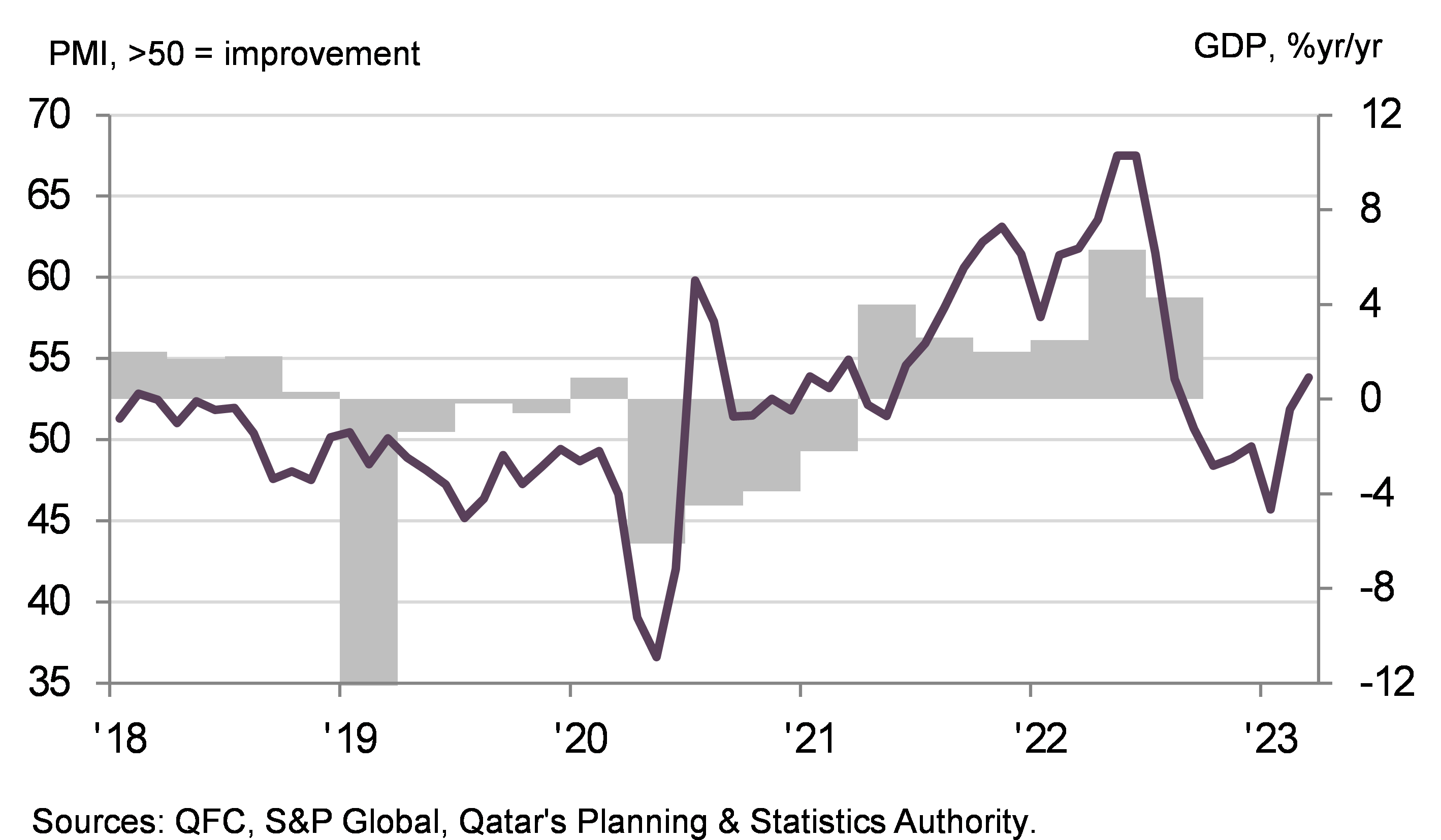 مؤشر PMITM لقطر التابع لمركز قطر للمال مقابل الناتج المحلي الإجمالي