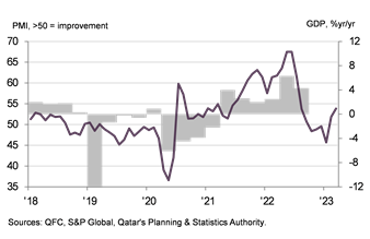 شَهِدَ النشاط التجاري لشركات القطاع الخاص غير المرتبط بالطاقة في قطر نمواً في نهاية الربع الأول من العام ۲۰۲۳ مع ارتفاعات أكثر حدةً في مؤشري الإنتاج والطلبات الجديدة. وسجّل كلا المؤشرين الفرعيين قراءة أعلى من متوسط الدراسة على المدى الطويل التي بدأت قبل أكثر من ست سنوات. ويُعزى ارتفاع مؤشر مديري المشتريات الرئيسي إلى أعلى مستوى له في ثمانية أشهر، إلى ارتفاع مؤشر التوظيف.