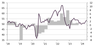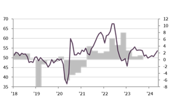 الناتج المحلي الإجمالي، سنة%/سنة PMI معدل موسميًا، >50.0 = تحسن منذ الشهر السابق