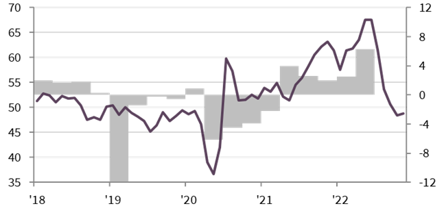 وواصلت المبيعات الجديدة تراجعها في نوفمبر ۲۰۲۲، لا سيما في قطاع الإنشاءات، حيث كان النمو في النشاط التجاري الكلي مرتبطاً بإنجاز الأعمال المتراكمة. وقد تم إنجاز الأعمال العالقة بوتيرة هي الأسرع منذ يوليو ۲۰۱۹.