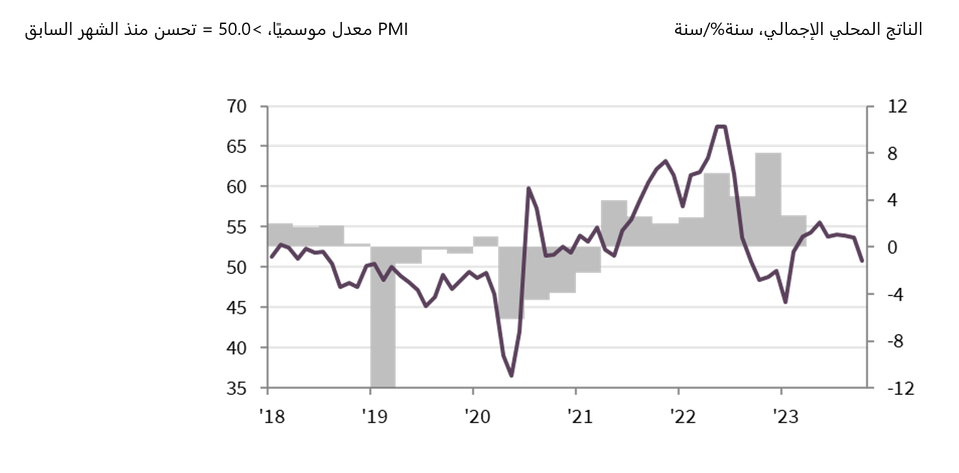 وانخفض مؤشر مديري المشتريات من ۵۳.۷ نقطة في سبتمبر إلى ۵۰.۸ نقطة في أكتوبر، ولكنه استمرَّ في تسجيل نمو إجمالي منذ فبراير ۲۰۲۳، رغم أنَّ القراءة الرئيسية للمؤشر كانت أدنى من متوسط الدراسة على المدى الطويل (البالغ ۵۲.۳ نقطة منذ ۲۰۱۷) في الفترة الأخيرة.