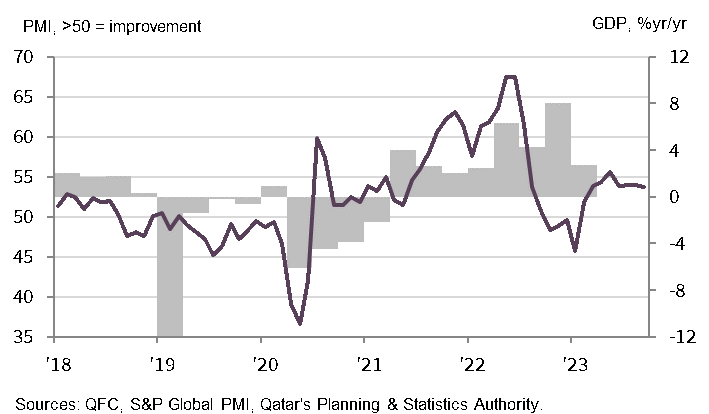 وتشير أحدث أرقام الناتج المحلي الإجمالي الى تصحيح في مؤشر مديري المشتريات بعد اختتام بطولة كأس العالم FIFA قطر ۲۰۲۳™ حيث انخفض معدّل النمو السنوي إلى ۲.۷% في الربع الأول من العام ۲۰۲۳. وأشار مؤشر مديري المشتريات إلى ارتفاع معدّل النمو في الربعين الثاني والثالث من العام ۲۰۲۳.![]()